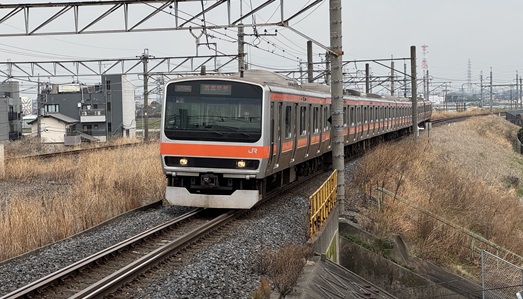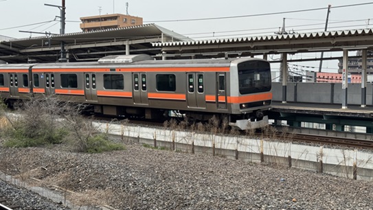 府中本町方面のホームから入線してくるE231系を撮影。駅前後と駅構内は緩いカーブを描いているので、車両全体を含めて撮影ができました。