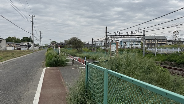 上の写真の反対側を見たところ。鉄道用地の中に線路がもう一本引けるスペースがあります。左の道路を進んでいきます。